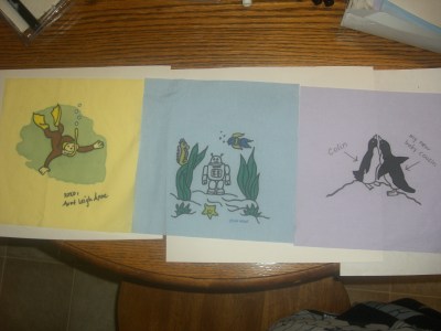 Aunt Leigh Anne was too busy helping other people at the shower, so she made her quilt squares later that night. Even though the quilt has an underwater/aquarium theme to match the baby’s room decor, Leigh Anne knew we liked monkeys and robots, so she made squares that combined our favorite things!