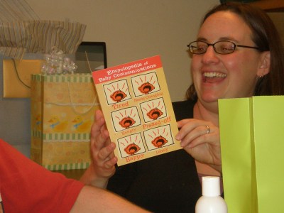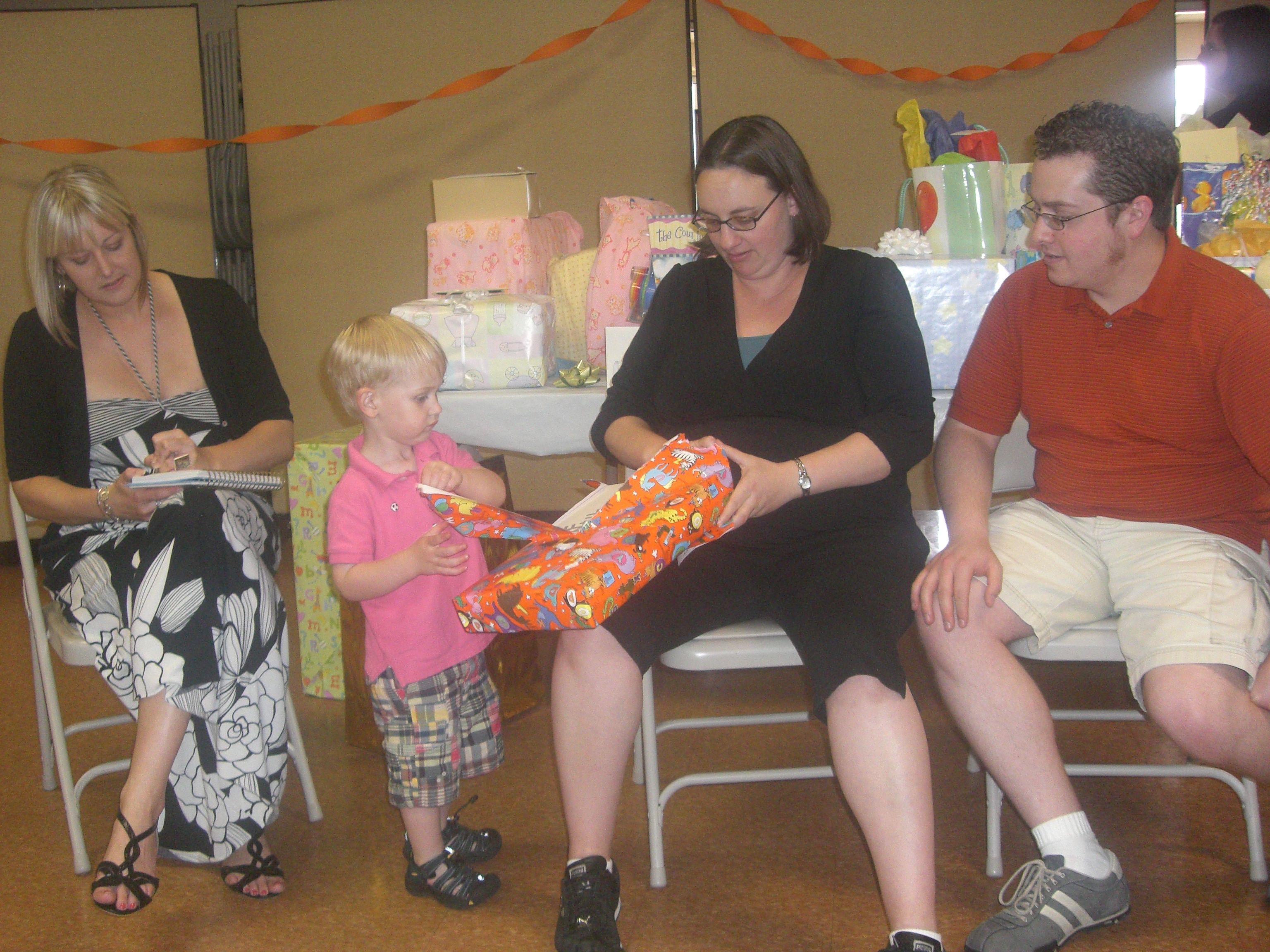 My favorite moment of the shower was a few minutes after our friend Kate arrived. For days in advance, our nephew Colin had been talking about this party for “his new baby cousin” and getting excited about it. He knew that his new baby cousin was in Aunt Lissa’s belly, and he had even felt the baby kick and talked to the baby (through my belly button, like it was a microphone). After Kate came in, she set down an infant carrier with her 2 month old daughter Avery in it and went back to her car for a moment. Colin walked by, saw the baby sitting in the carrier, and turned to me incredulously. “Is THAT my new baby cousin?” he asked, surprised that a baby had appeared at the party. It was basically the cutest thing ever. Colin was still happy to play with Avery though, after we told him that this was Kate’s new baby and that his new baby cousin was still safely in Aunt Lissa’s belly for now.