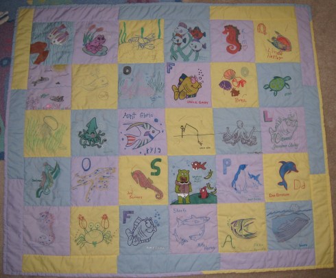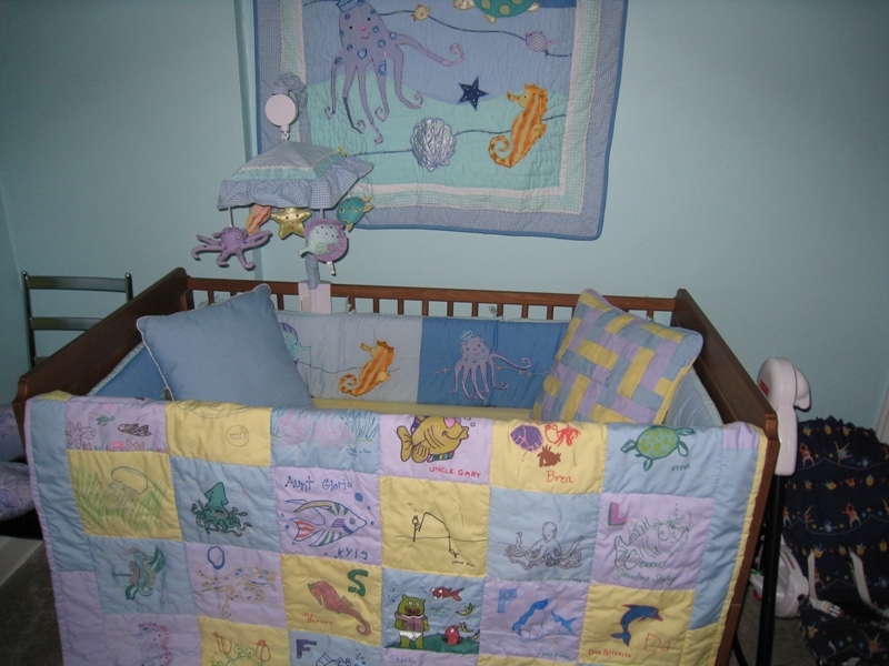 Our family and friends contributed squares to the baby quilt at our baby showers in Topeka and Collinsville, then Nana sewed it all together. The quilt is reversible because we had so many squares to include! We think it looks great, and each square is precious because of the people and relationships it represents.