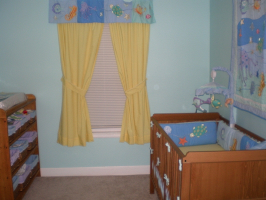 This is a room created with love by our family and friends. The walls were painted by Dan and his dad Steve and our friend Carrie. The bookshelf was made especially for the baby by Papa Staley (who swore he would never make Lissa nother bookshelf for fear our house will collapse from the weight of our books!) , and it is already filled with many books from our favorite children’s librarian, Grandma Mary! Our two and a half year old nephew Colin had just about outgrown his changing table/dresser and mirror that Papa Staley made for him. The crib from Ikea was so highly rated here that is was almost impossible to find one in stock, so we were excited to eventually get one. Nana sewed the yellow curtains and the blue and purple basket liners (along with several matching pillows and crib sheets.)
