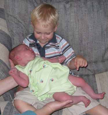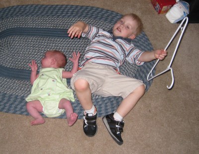 We tried to take a picture to show the size difference between the cousins — Kivrin is about 2 weeks old here and Colin is about two and a half years old. Colin was enamoured with this hanger though, telling us all that he was “going to hook us”, so this was the best photo we got.