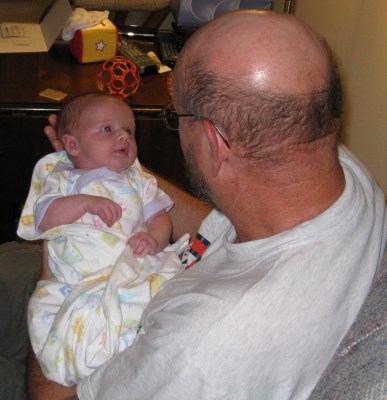Colin was excited to meet his much anticipated “new baby cousin.” He sang her “Happy Birthday” and “Twinkle” and he tickled her toes. While he was holding her, she reached up and touched his face, then turned her open mouth towards him, making him worry that she was trying to eat him!