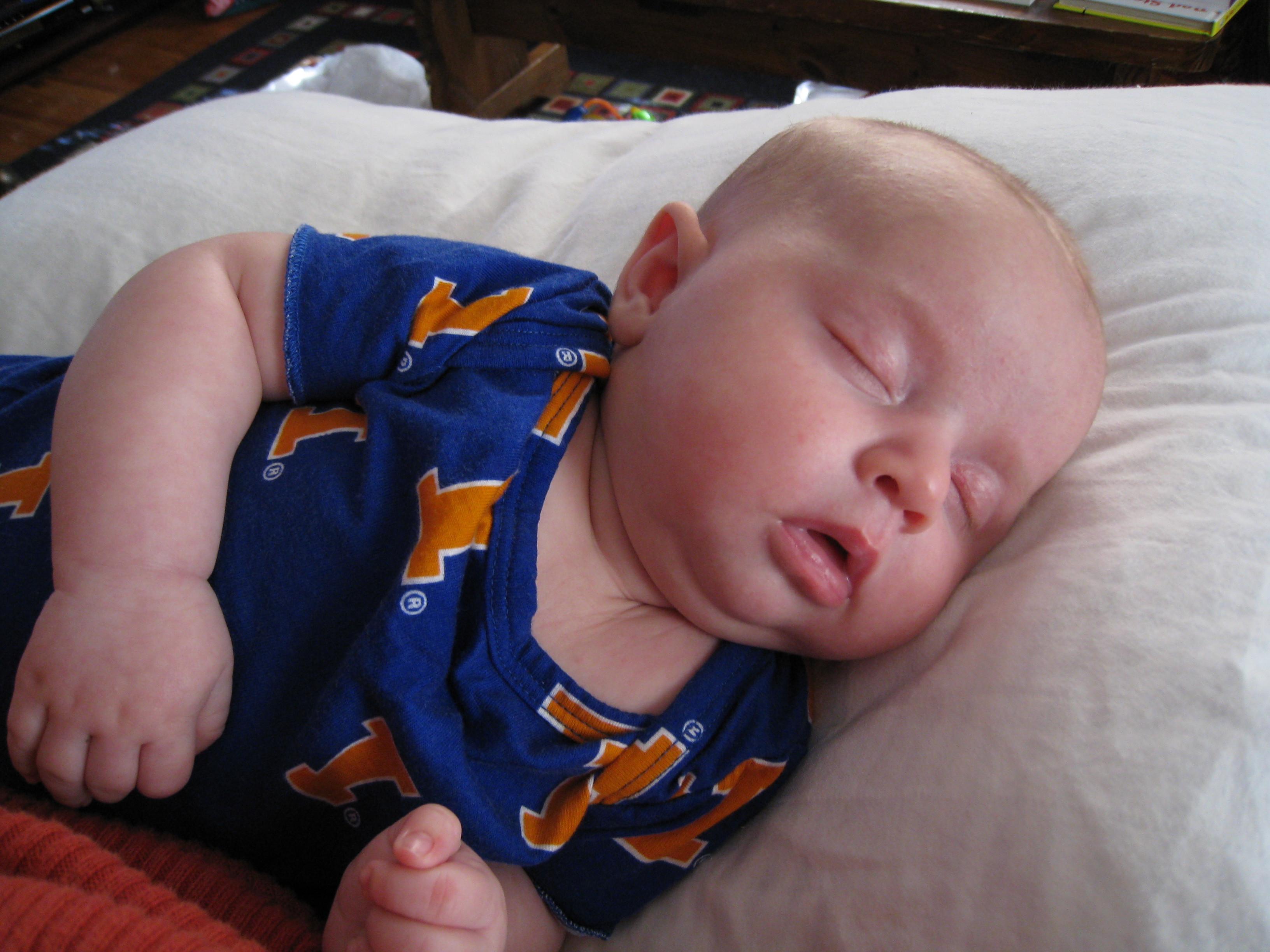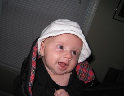 You may have noticed that sometime right after she was born, most of Kivrin’s hair disappeared. I’m happy to report that she has some hair growing again on top of her head, although it is so short that right now it looks like she is sporting a little baby buzz cut. The jury is still out on her hair color, but it seems sort of blondish-brownish to us.