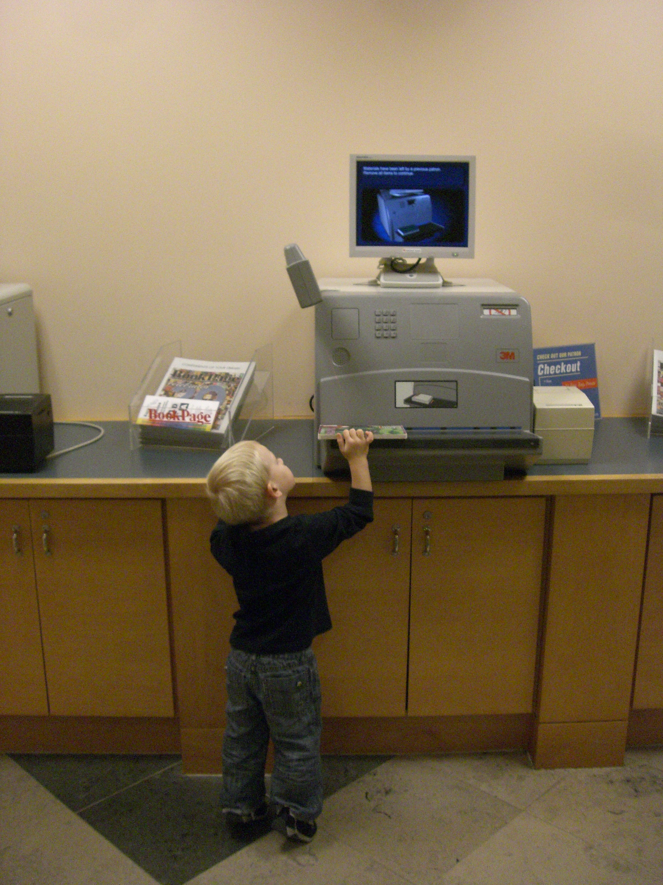 The morning after Colin arrived in Kansas, we all headed to the library. We visited Uncle Dan while he was working, ate a snack in the cafe, did some singing and dancing at preschool storytime, watched the fish get fed in the aquarium, and played in the house in the children’s area. Kivrin let Colin use her library card to check out a few board books to read.