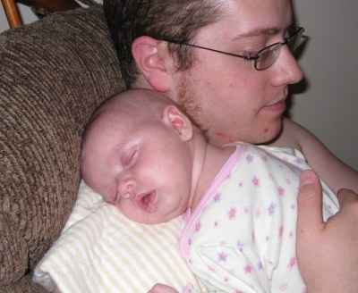 The joys of parenting. Kivrin is still rejecting the bottle and dependant on the silicone shield to nurse. On Monday, while I discussed “Heart of Darkness” with my library book group, Dan watched Kivrin at home for two hours. She wouldn’t take my milk from the bottle and then cried herself to sleep.