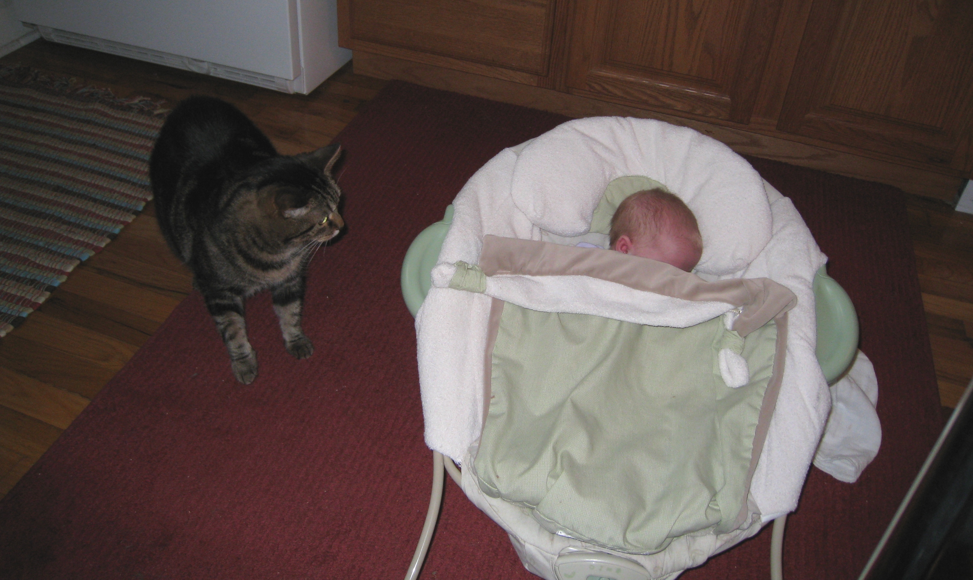 Ella (the little cat) will occasionally walk up and sniff Kivrin’s hand, but generally could care less if the baby is awake, moving around, crying, etc.