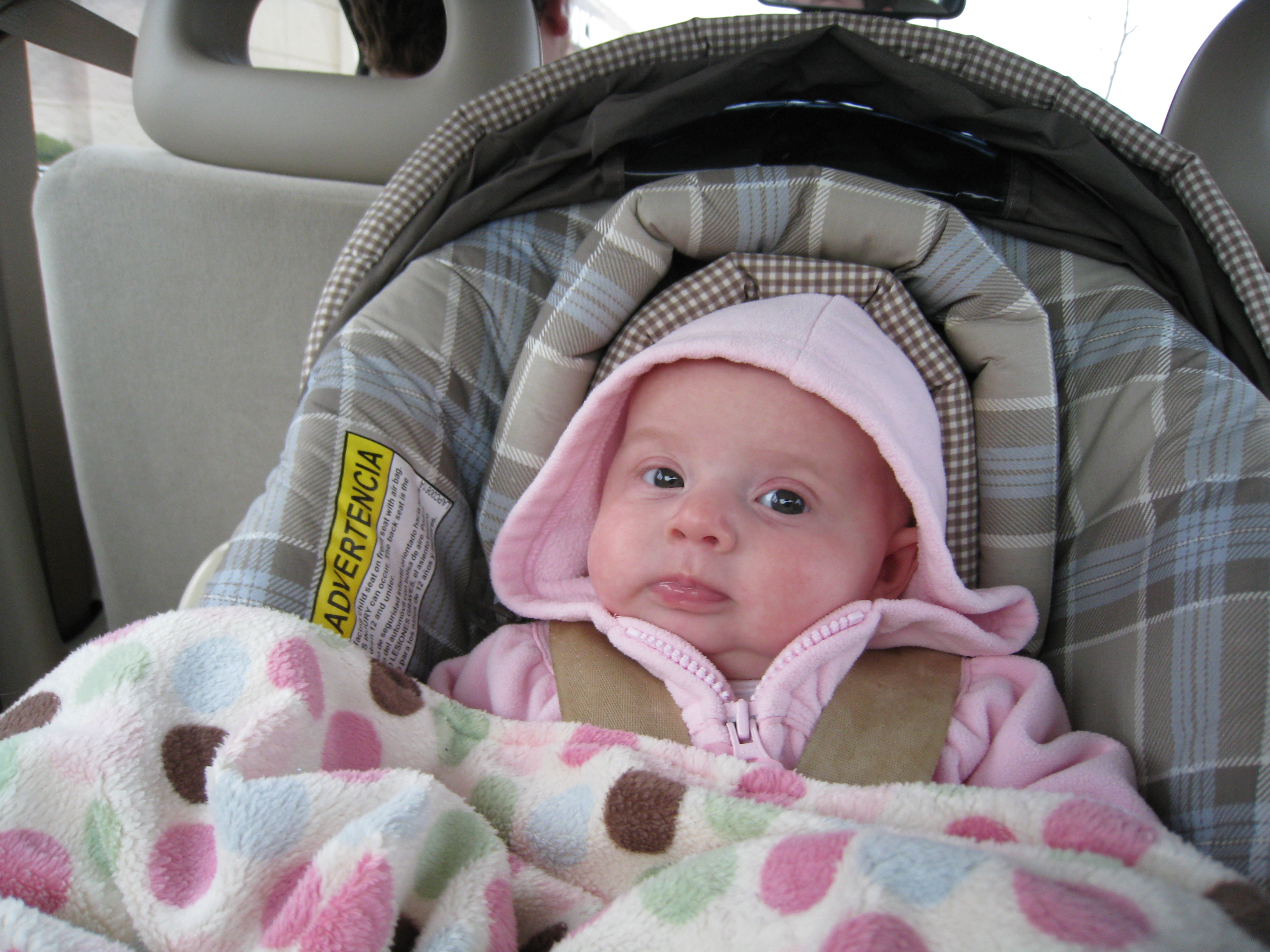 We are so lucky that Kivrin doesn’t mind the car seat too much. One of us usually sits in back with her if she is awake, although she isn’t awake for long on most trips longer than 5 minutes, and sometimes she doesn’t make it on the trips less than 5 minutes either. The library, the grocery store, and her child care center are all about 5 minutes away from our house, so she isn’t in the car seat for very long on most trips.