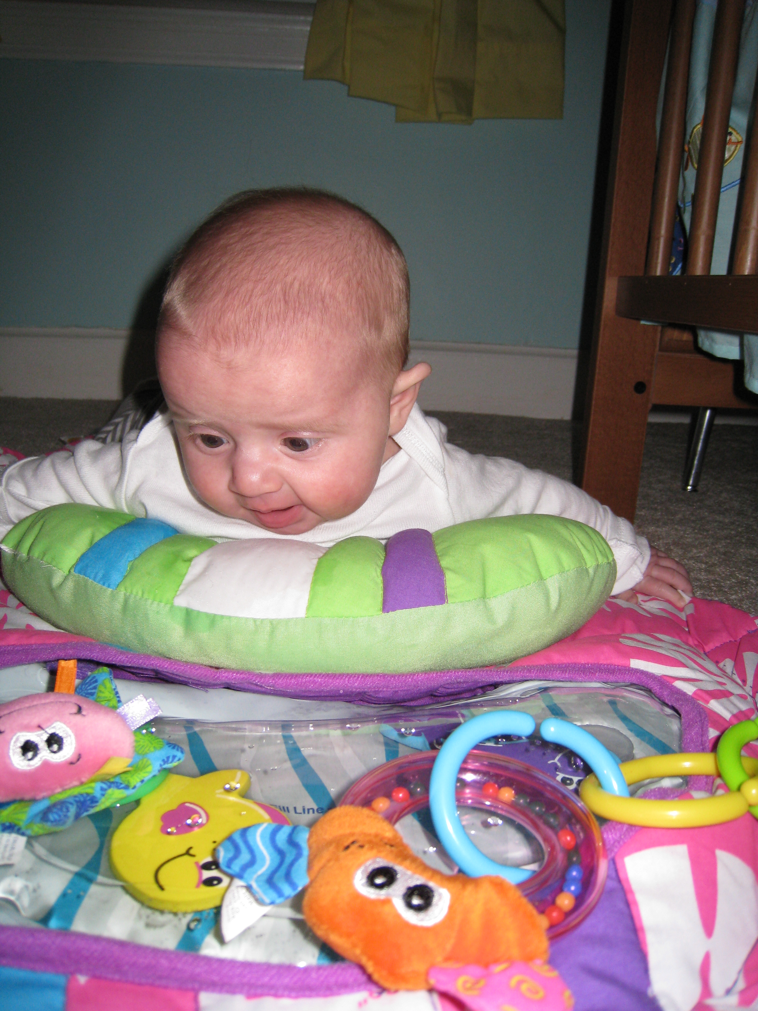I got the surf board on clearance for like $10, because it’s not like Kivrin actually needs a special surfboard on which to practice holding up her head — but sometimes Mommy needs a reminder to play with the baby this way, and the surfboard is more attractive than a post-it-note that says “Belly Time!” which is what I was considering before…