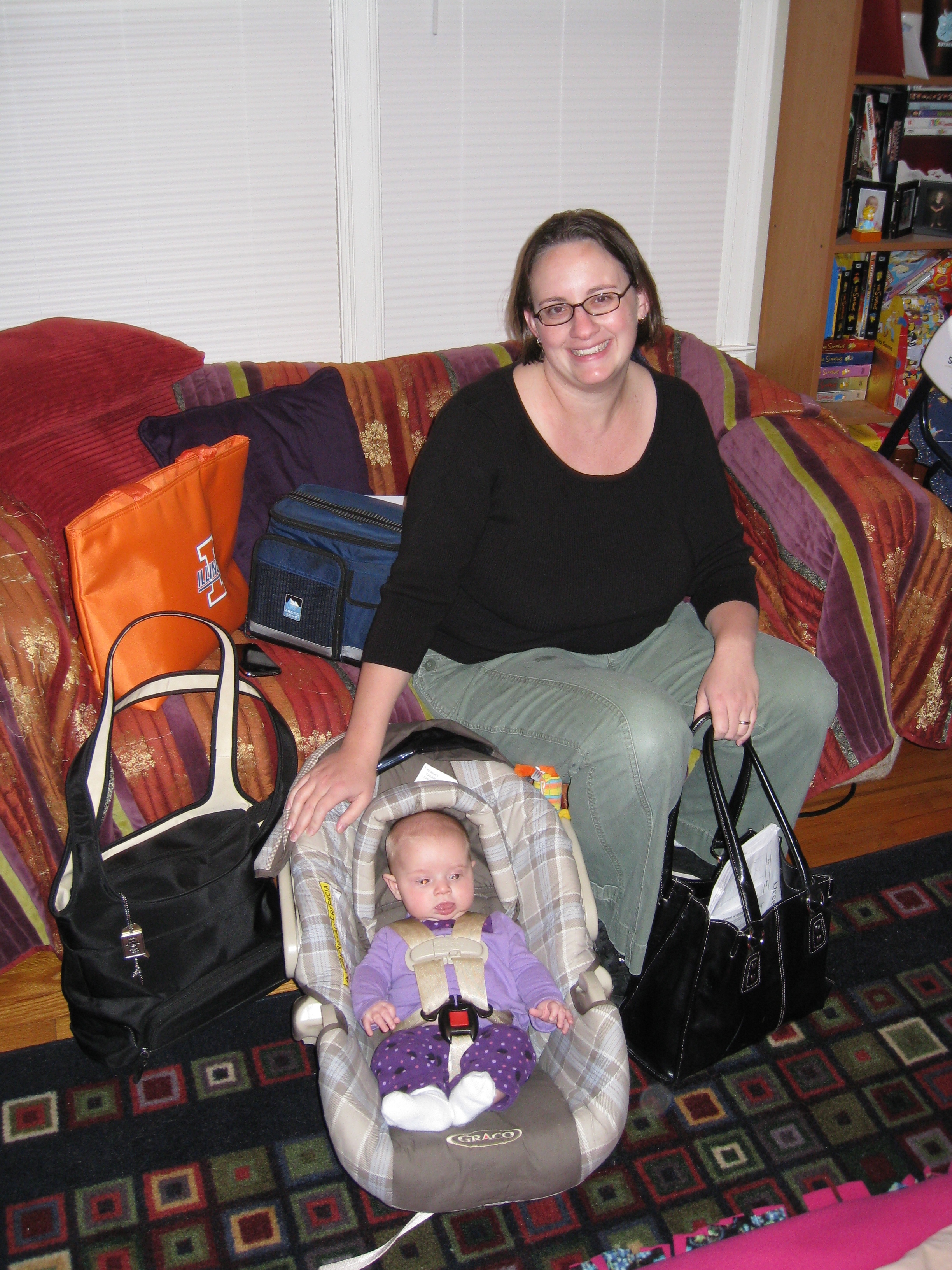 Getting out the door in the morning now requires a lot more stuff – a day care bag, a pump, mom’s lunch (with Kivrin’s bottles for the day in it), mom’s purse, plus the car seat. On Wednesday is was even worse because we had plans after work, so we added the regular diaper bag plus a bag of supplies for the meeting we were attending. So far, with careful double-checking, we re doing pretty good about not forgetting anything.