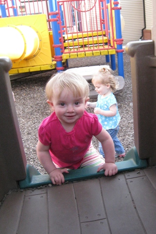 The bubble supplies on the back porch are a constant source of amusement (and distraction, since we pass them going in and out of the house.) Mostly the extra wands serve as interesting and colorful toys since Kivrin hasn’t mastered actually blowing bubbles yet. She LOVES to dip a wand in the container and then blow gently on the stick end, and accidentally fling bubble solution all over Mama or Dada though, that is for sure!