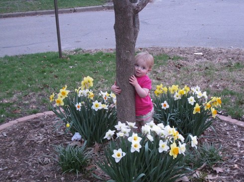 When we couldn’t get Kivrin to just stand and pose with the daffodils, we opted instead for an action shot of “hug the tree” which she was happy to do!
