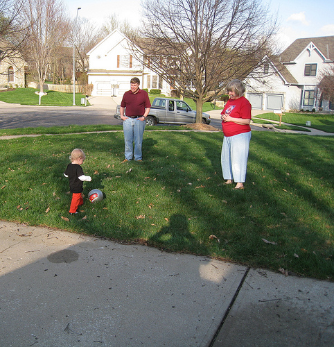 Kivrin liked playing kick ball with Grandpa and Grandma in their yard.