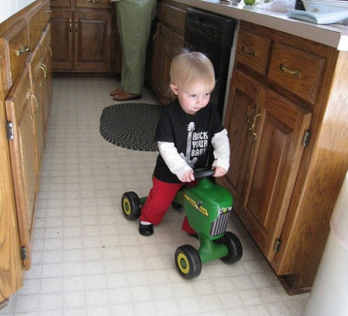 Post-church, Kivrin wore her comfy clothes and played in the kitchen at Grandma and Grandpa Fogt’s house.